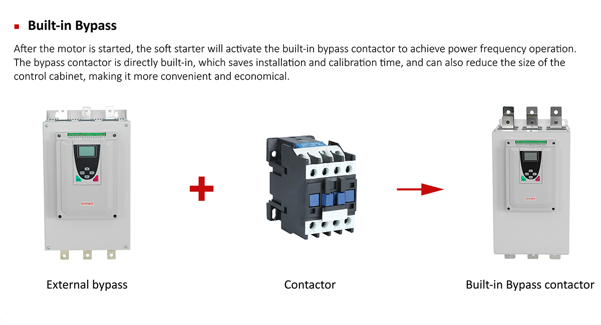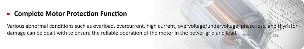 | Védelmi funkció | Fáziskiesés elleni védelem, túláramvédelem, túlterhelés elleni védelem, áramkiegyensúlyozatlanság elleni védelem, túlmelegedés elleni védelem, indítási időtúllépés elleni védelem, túlfeszültség-/túlfeszültség elleni védelem, frekvencia túlindítás elleni védelem, nagyáram elleni védelem, tirisztor meghibásodás elleni védelem, teljesítmény fordított sorrendű védelem, kábelezési hiba védelem, stb. |