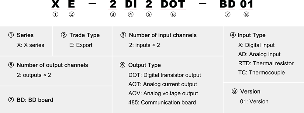 | 8 | XE-1AI1RTD-BD | 1AI, 16 bites áramtípus; 1 utas hőellenállás, PT100 támogatás | analóg bemenet ×2, RTD bemenet ×1 |