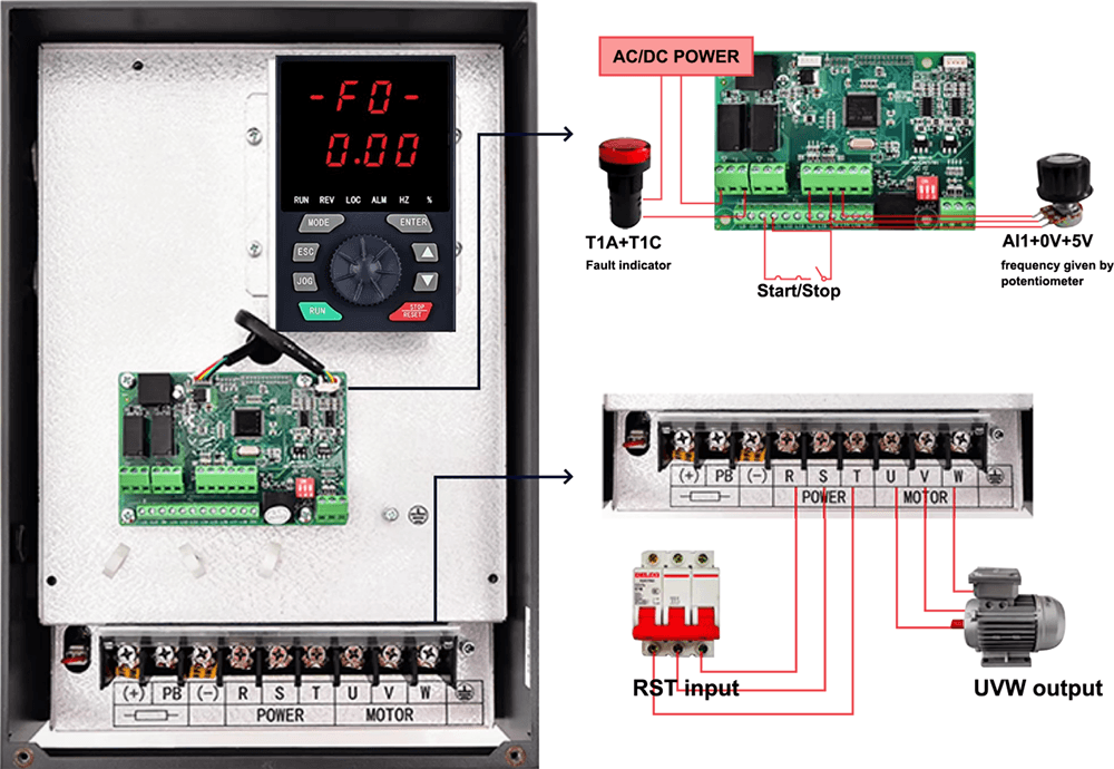| Relé kimenet | T1A, T1B, T1C T2A, T2B, T2C | T1A alaphelyzetben nyitott, T1B alaphelyzetben zárt, T1C közös pont T2A alaphelyzetben nyitott, T2B alaphelyzetben zárt, T2C közös pont Érintkezési kapacitás: 5A@250VAC, 5A@30VDC Hiba, riasztás, beállított frekvencia érkezés és egyéb funkciók opcionálisak A T1A alapértelmezés szerint hibás, a T2A alapértelmezetten működik A 220V 0.4kW-2.2kW és a 380V 0.4kW-1.5kW termékek csak 1 relé kimenettel rendelkeznek, azaz TA TB TC |