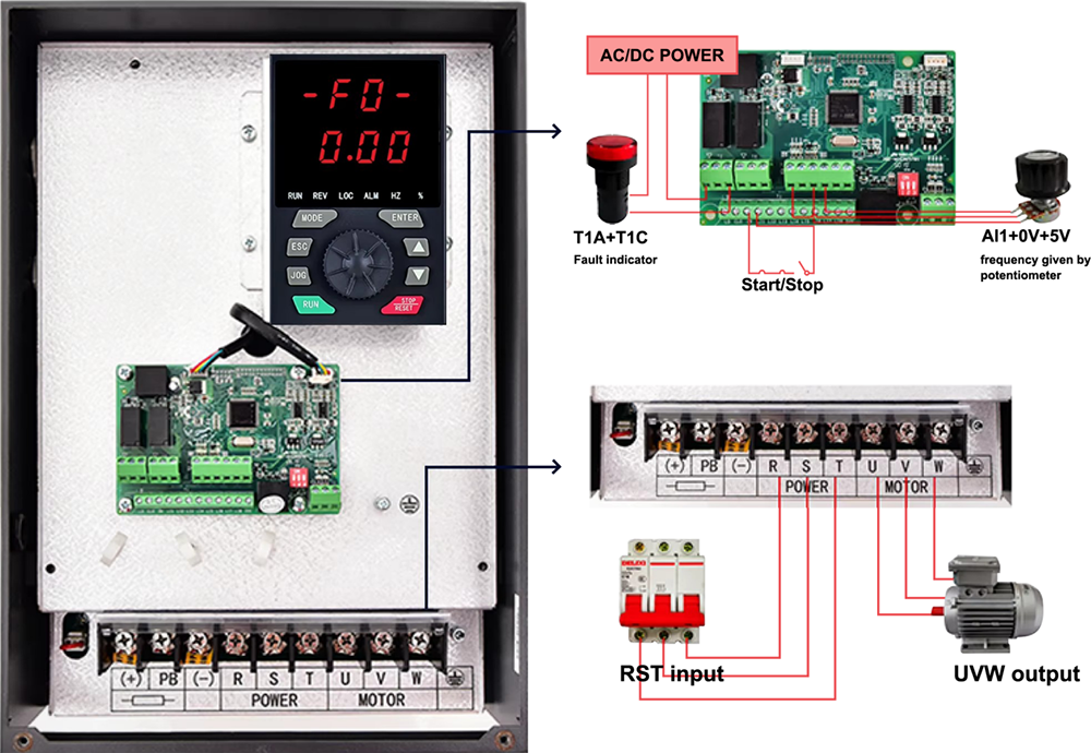 | Relé kimenet | T1A, T1B, T1C T2A, T2B, T2C | T1A alaphelyzetben nyitott, T1B alaphelyzetben zárt, T1C közös pont T2A alaphelyzetben nyitott, T2B alaphelyzetben zárt, T2C közös pont Érintkezési kapacitás: 5A@250VAC, 5A@30VDC Hiba, riasztás, beállított frekvencia érkezés és egyéb funkciók opcionálisak A T1A alapértelmezés szerint hibás, a T2A alapértelmezetten működik A 220V 0.4kW-2.2kW és a 380V 0.4kW-1.5kW termékek csak 1 relé kimenettel rendelkeznek, azaz TA TB TC |